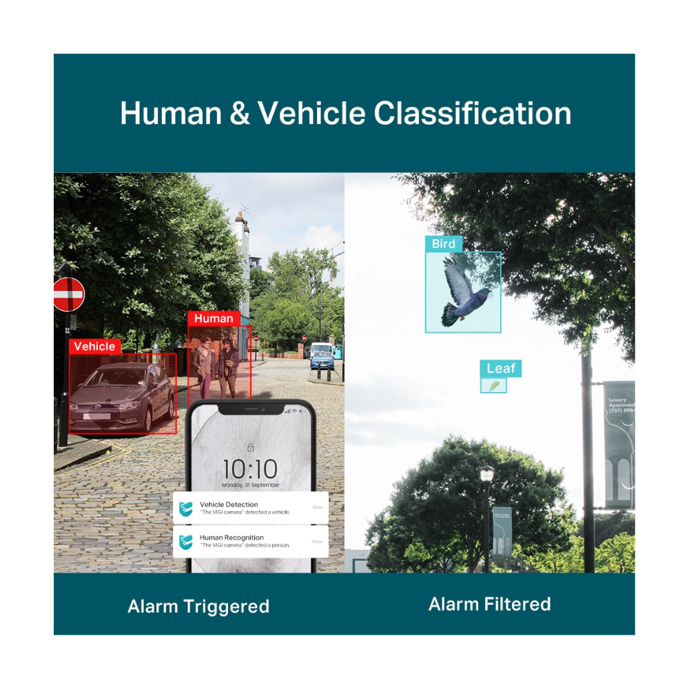 - Clasificación de humanos y vehículos. Los algoritmos IA integrados analizan la imagen distinguiendo humanos y vehículos de otros objetos.