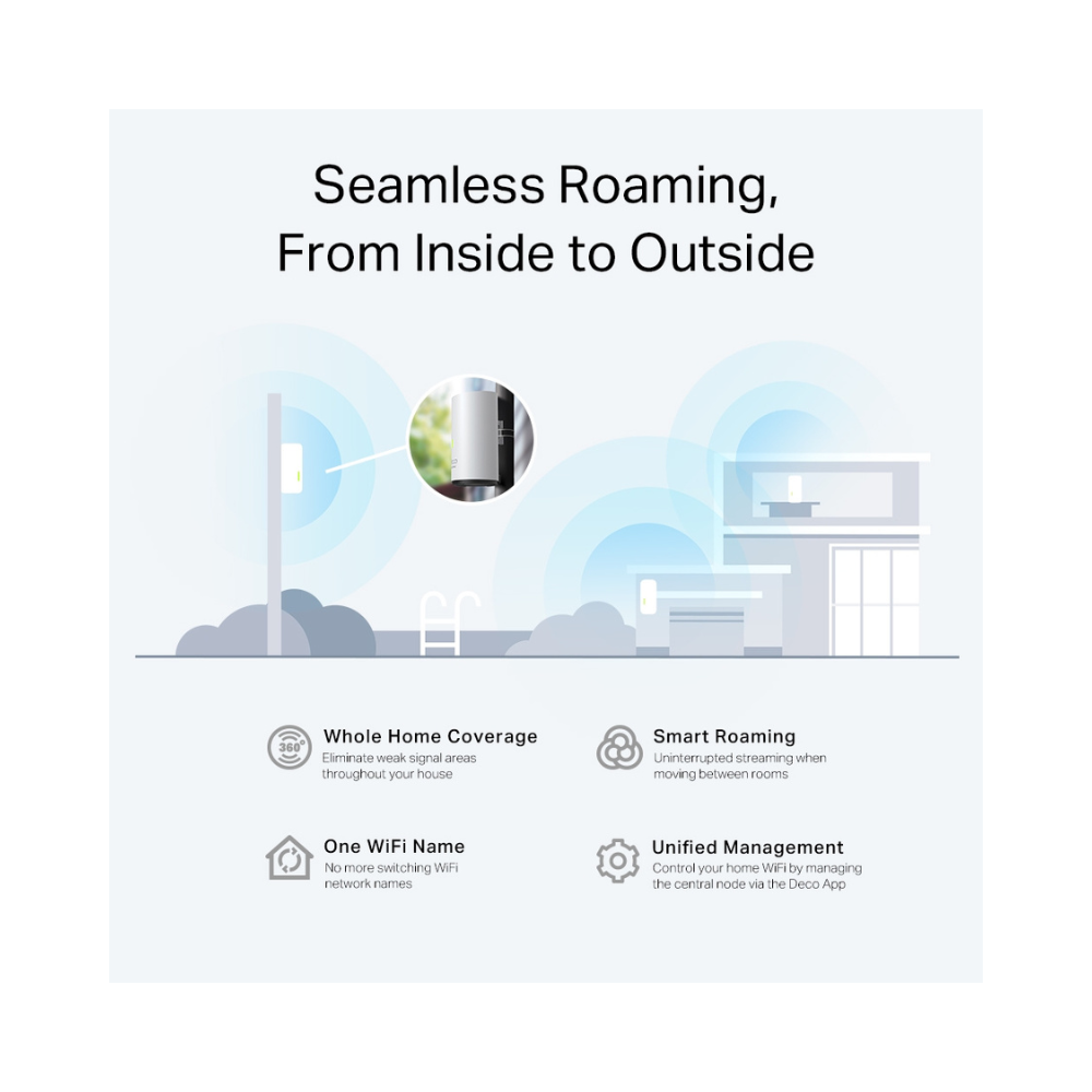 - Cobertura en toda la casa y fuera de ella. La tecnología Deco Wi-Fi 6 Mesh lleva la señal de internet a todos los rincones hasta 230 m2